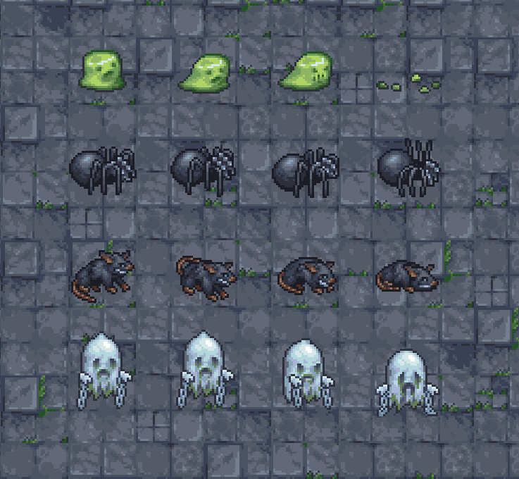 6 enemies (skeletons, slime, rat, ghost, spider…)